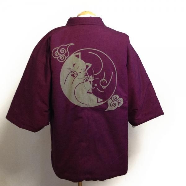 【日本製】江戸てんオリジナル!久留米手づくり綿入れ半纏(はんてん)抜染 (フリー, 巴猫(ともえねこ)【エンジ】) …